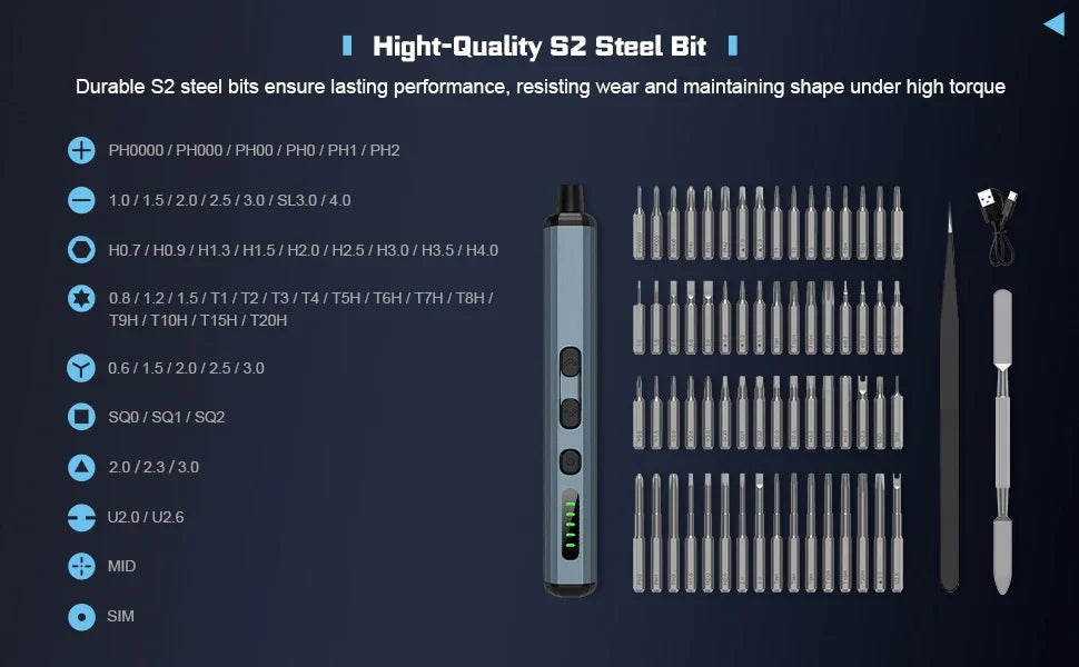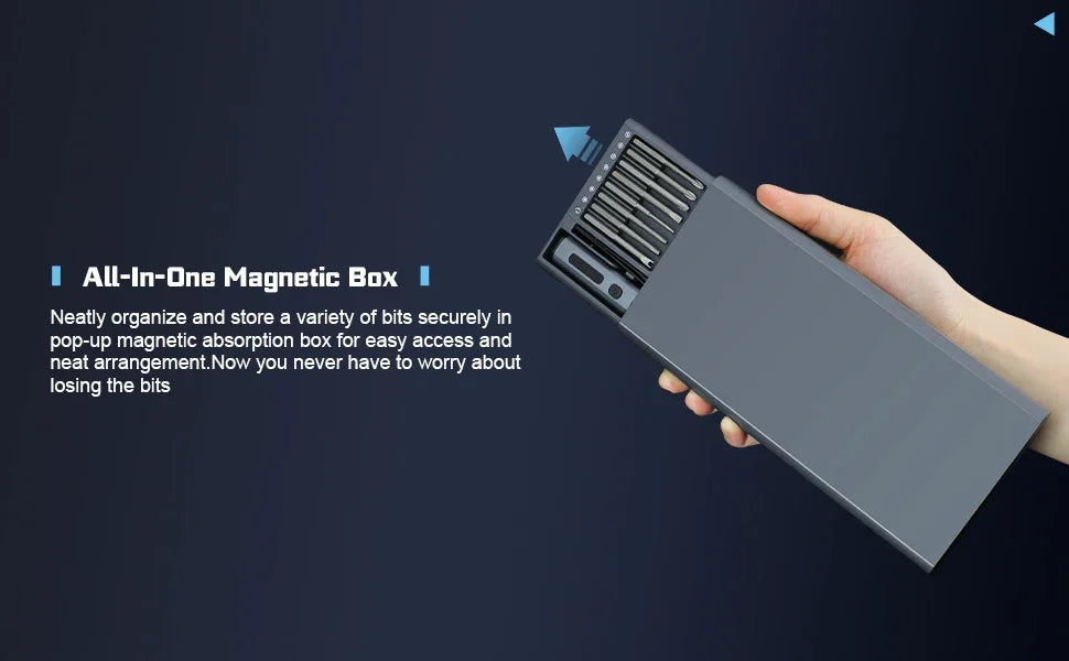 Das Set enthält 15 Präzisionsbits, darunter Phillips, Torx, Flach und Dreieck, um alle Anforderungen abzudecken.